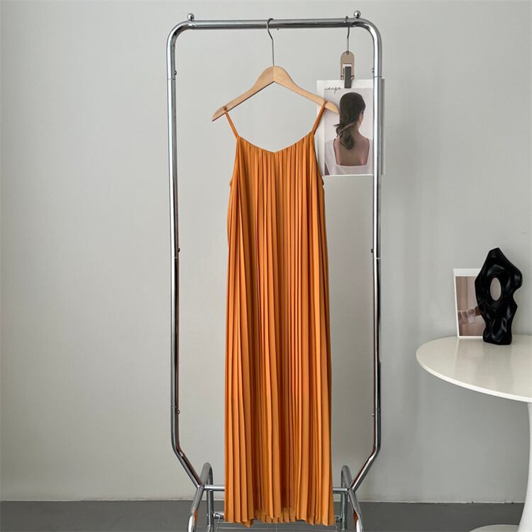 エレガント雰囲気のノースリーブ·ストラップ ゆったりラフ風プリーツロングワンピース