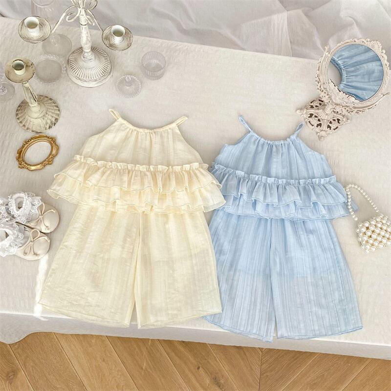 2025夏新作 子供服 ノースリーブ セットアップ ベスト ワイドパンツ 涼しげ キャミソール フリル