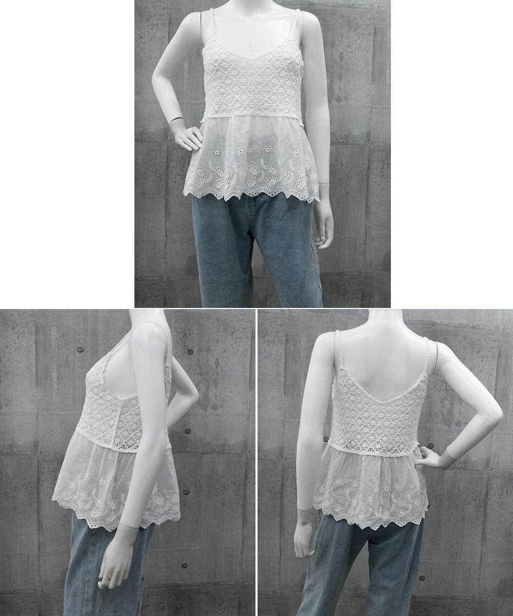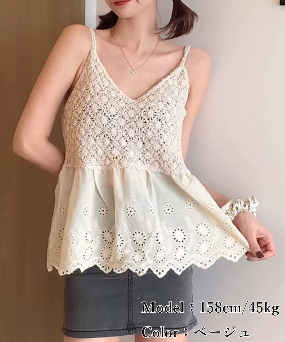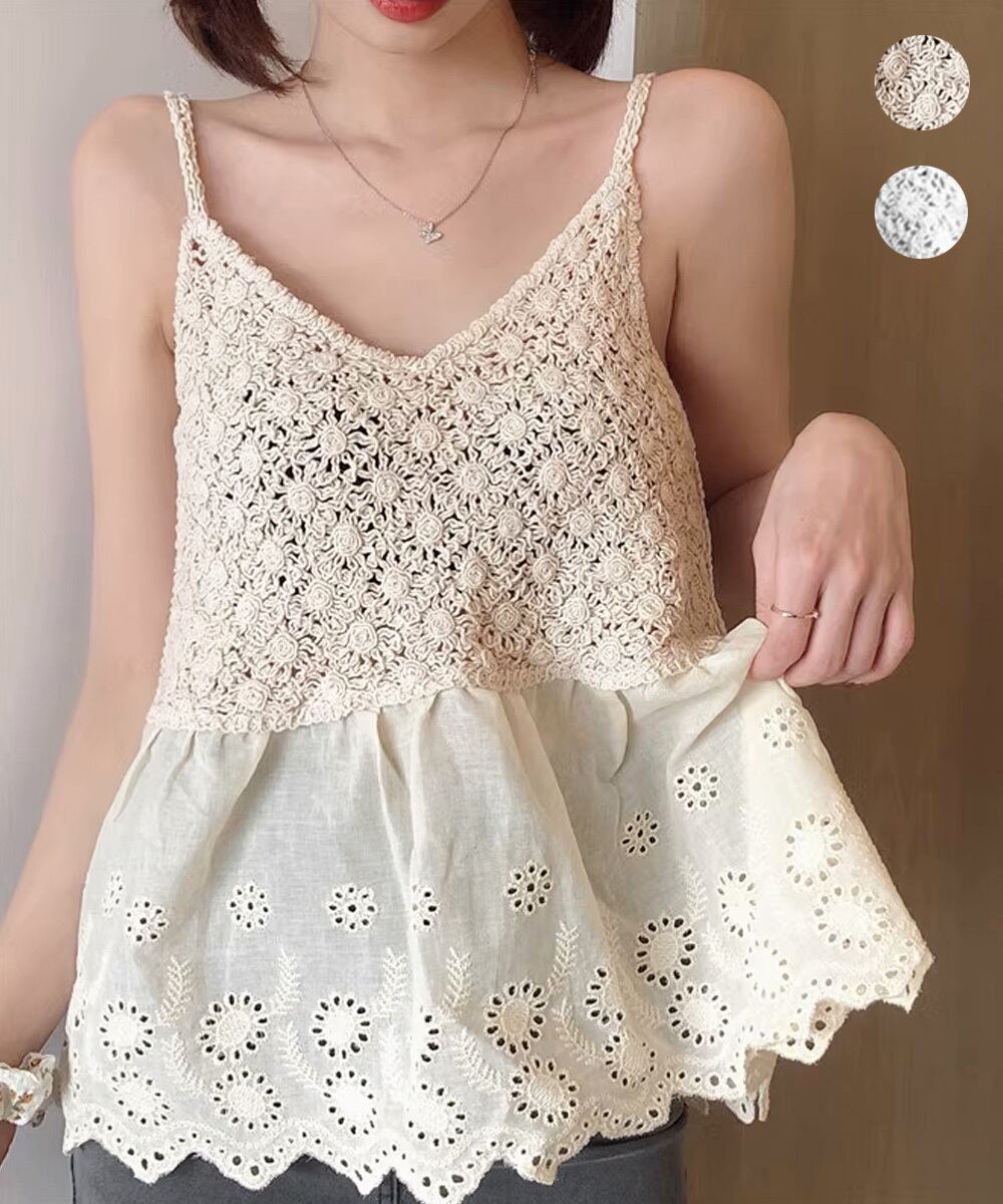 レディース クロシェ編みニットキャミ 切り替え ノースリーブ サマーコーデ 肌見せ 大人可愛い カジュアル 薄手トップス