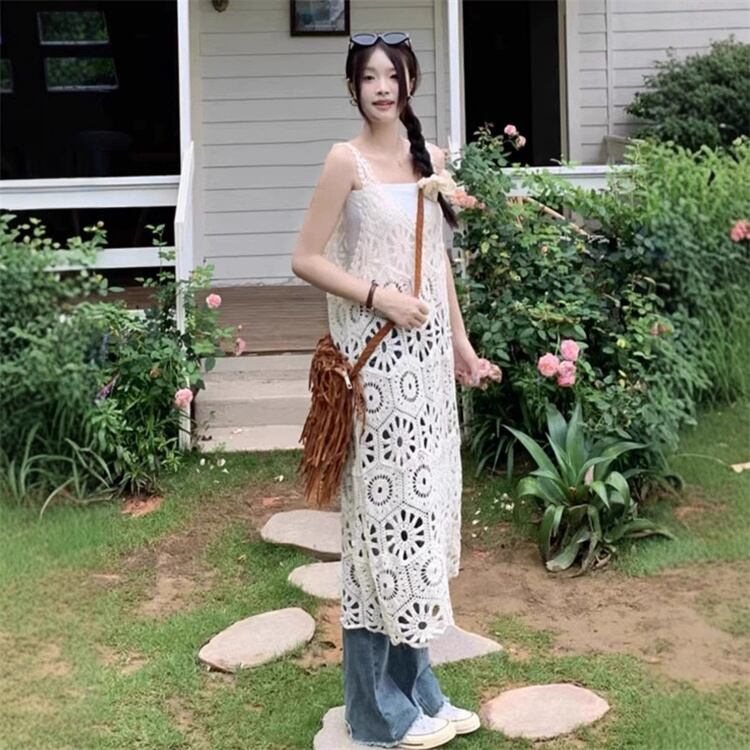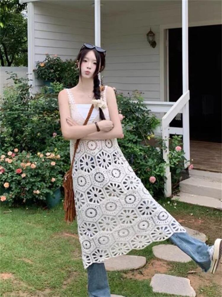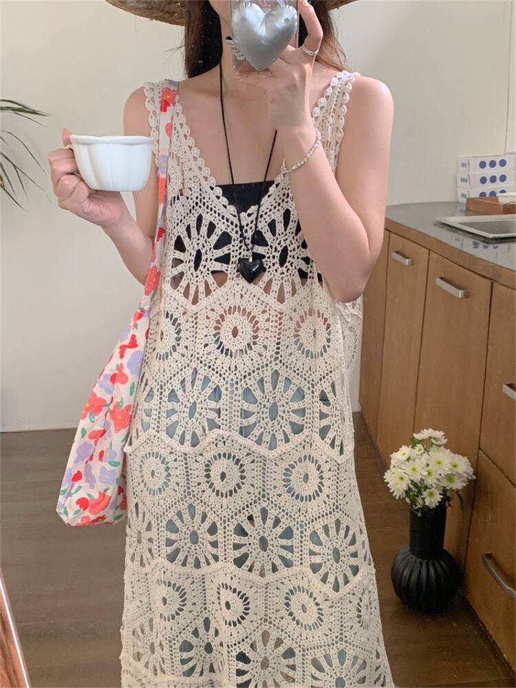 繊細なフックレースとレース編みが上品なVネックのノースリーブワンピース。ロング丈のシルエットがスタイルをすっきり伸ばし、透かし編みの素材で涼やかな着心地です。レトロな雰囲気の中に現代的なデザイン感をプラス◎オフィスやデートに差をつける一枚です。