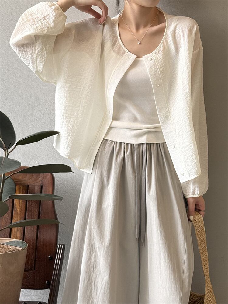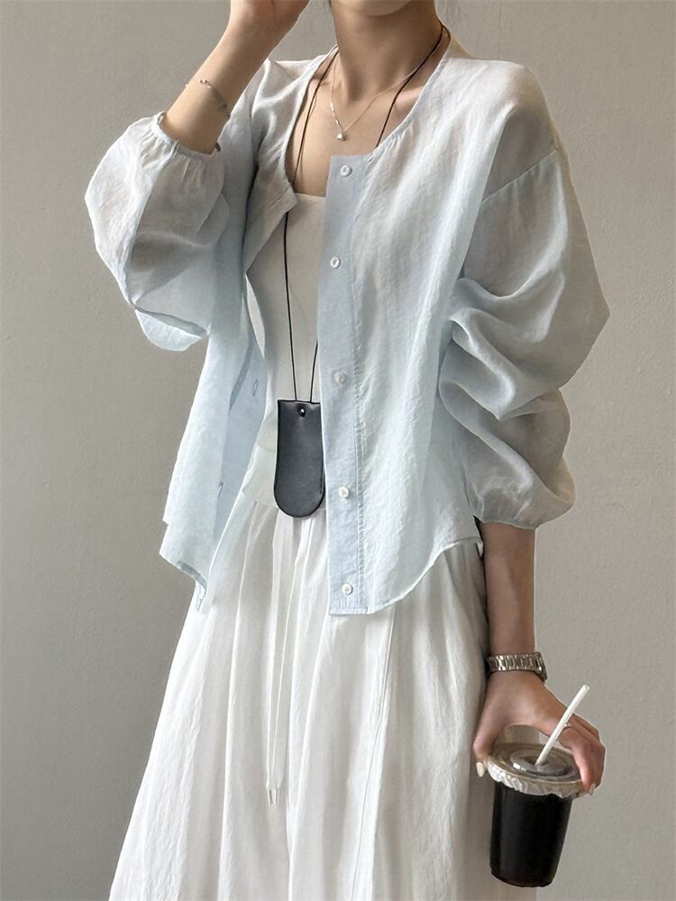 【2025夏】シンプルUVカットシャツ 丸首長袖 オーバーサイズ カジュアルトップス
