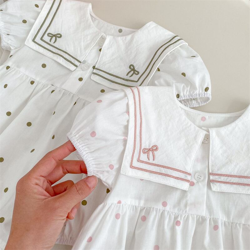★ベビー服 女の子 セーラーカラー 半袖 ロンパース 子供服 可愛い 水玉 刺繍リボン柄