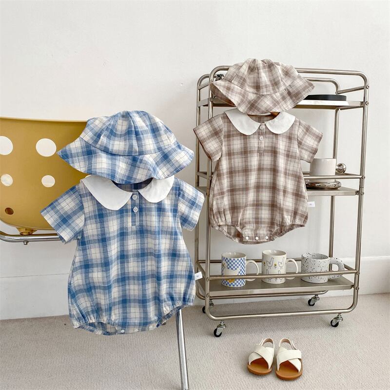 ベビー服 帽子付き 格子 半袖 ロンパース 女の子 男の子 可愛い 子供服 おしゃれ