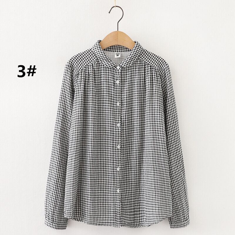 シャツ レディース 長袖 襟付き ガーゼシャツ トップス ブラウス コットン ホワイト チェック柄 シンプル