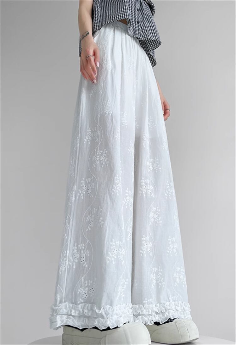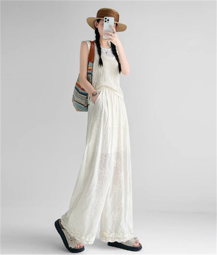 綿麻レース空いたデザインワイドパンツ 高めウエストライン 薄生地で涼しい2025年夏向けロングパンツ