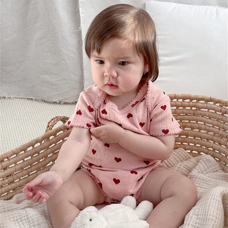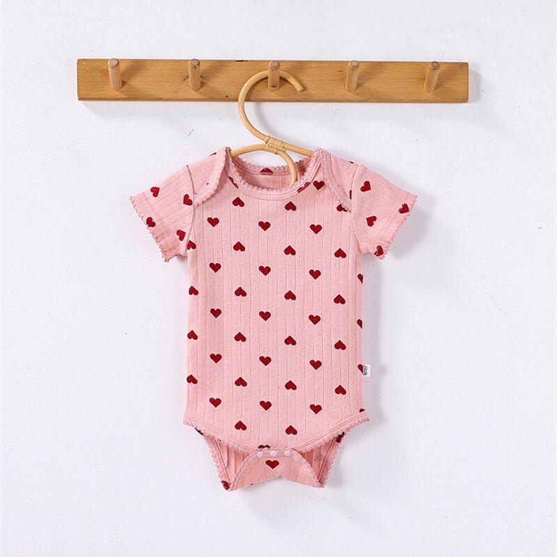 2025夏新作 ベビー服 女の子 半袖 新生児 リブ ロンパース 柔らか ハート柄 リボン柄 子供服