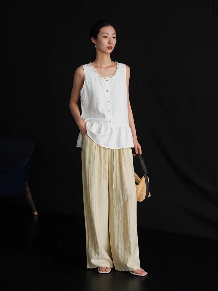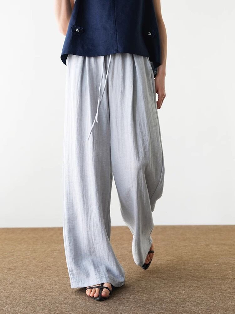 夏の涼感スタイルアップ麻薄手ストレートワイドパンツ抗シワ加工付き