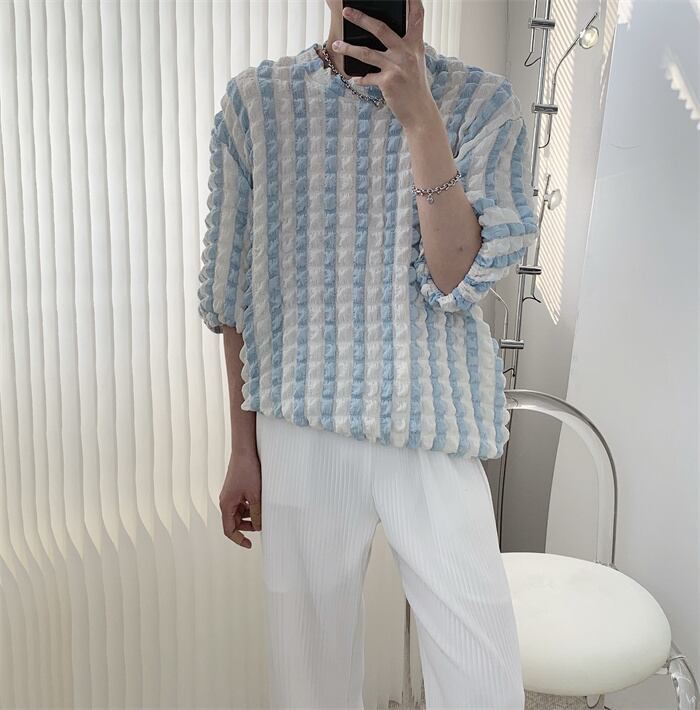 新作限定SALE! バブルグリッド/ストライプ/半袖/Tシャツ/メンズ/サマー/イン/カジュアル/トップス