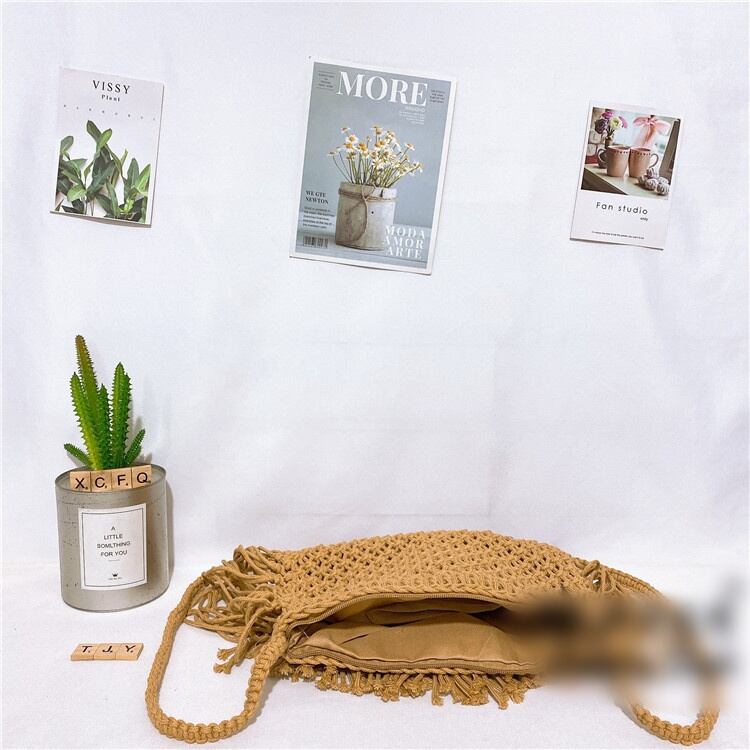 超人気ins話題 三角フリンジ付き コットンコード編みショルダーバッグ ストローリゾート風斜めがけバッグ