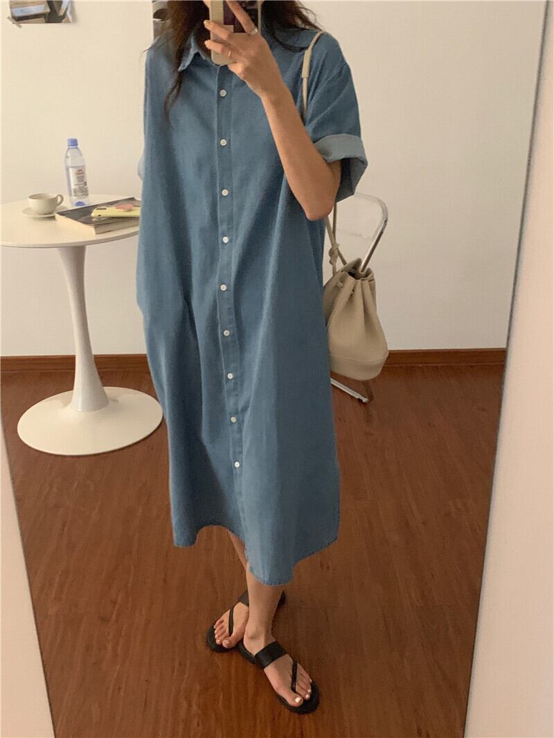 ★ワンピース デニム シャツワンピース ロング丈 レディース 半袖 着回し スタイリッシュ