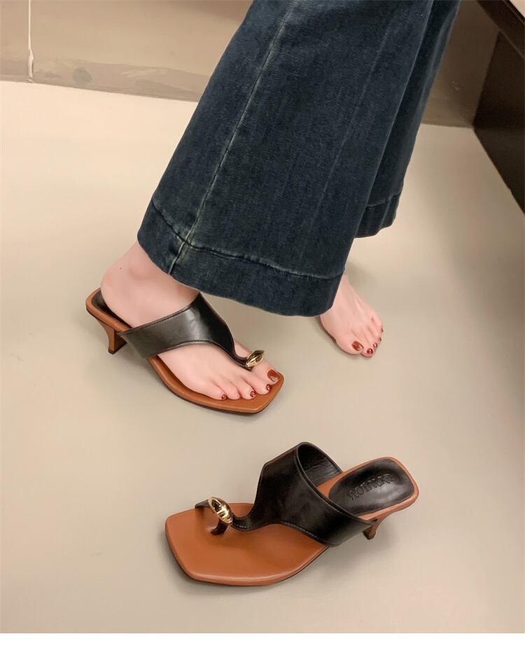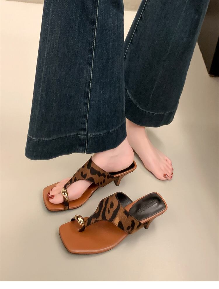 レオパード メタリックバックル つまみサンダル ハイヒール 2025夏季 リゾートサンダル おしゃれ 外はきOK