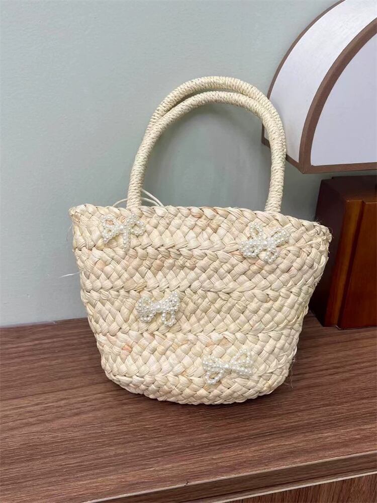 リボン付き手編みバッグ 軽量ストロー製ビーチバッグ 海辺リゾートおしゃれトートかごバッグ