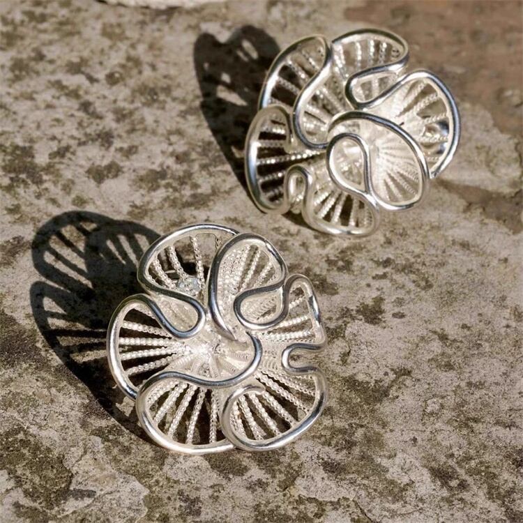 人気沸騰 大人気 立体フラワーモチーフのアートイヤリング 透け感&シボ調で上品な輝き
