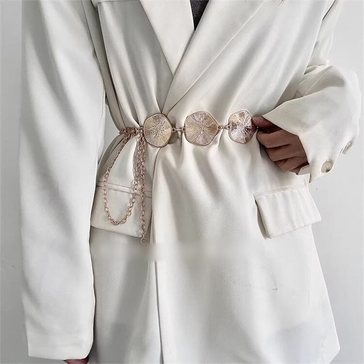 上品な金色とシルバーのメタルフックチェーンが特徴のスリムベルトです, シンプルながらも華やかな雰囲気で、ワンピースやスーツ、カジュアルコーデまで幅広くマッチします。軽量設計で身につけやすく、チェーンの繊細な輝きがスタイルをグレードアップ! チェーンの長さ調節可能で、春から秋まで季節を問わず使える、使い勝手の良さが魅力です。